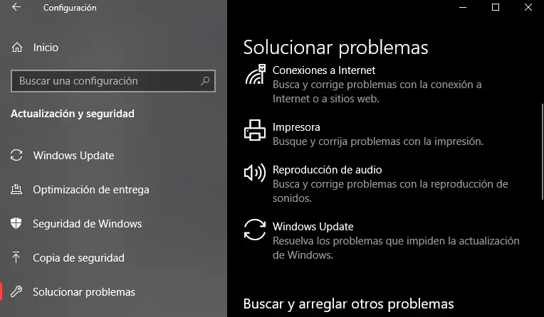 Et enfin, si nécessaire, nous pouvons utiliser l’ utilitaire de résolution des problèmes de Windows Update, une section à laquelle nous accédons depuis «Paramètres / Mise à jour et Sécurité / Dépannage», où nous pouvons déjà voir une section dédiée à Windows Update .