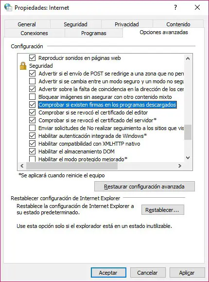 Si nous voulons désactiver ce message, nous pouvons également le faire en suivant les étapes ci-dessous. La première chose à faire est d’ouvrir le panneau de configuration et d’accéder aux options Internet. Une fois là-bas, nous allons dans l’onglet Options avancées et dans la liste des options de configuration, nous descendons aux options de sécurité.