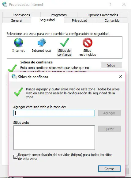 Depuis la fenêtre des propriétés Internet elle-même, nous passons de l’onglet Options avancées à l’onglet Sécurité et marquons l’option Sites de confiance . Ensuite, cliquez sur le bouton Sites et ajoutez le site Web pour lequel nous voulons désactiver le message de vérification d’identité du site, car il s’agit d’un site Web de confiance que nous connaissons déjà. Nous enregistrons les modifications et à partir de ce moment, nous ne verrons plus l’écran d’erreur lors de la visite de cette page Web, mais nous verrons les autres sites non sécurisés.
