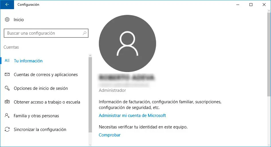 Et si nous sommes des utilisateurs de Windows 10, nous pouvons également le vérifier depuis la page de configuration à laquelle nous pouvons accéder depuis le menu Démarrer> Paramètres . Une fois sur place, nous choisissons l’option Comptes , puis nous sélectionnons l’option de menu Vos informations . Sur le côté droit, nous pouvons voir comment notre nom, notre compte de messagerie apparaît et si nous avons des privilèges spéciaux, le mot Administrateur apparaîtra juste en dessous.