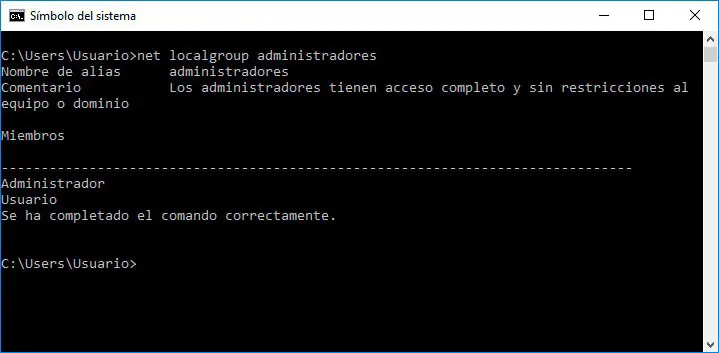 Bien que ce ne soit peut-être pas le plus utilisé, nous allons voir comment connaître les comptes système qui ont des autorisations d’administrateur sur l’ordinateur via la ligne de commande. Pour ce faire, la première chose à faire est d’ouvrir une fenêtre d’invite de commande, puis d’exécuter la commande net localgroup administrators . Dès que nous appuierons sur Entrée, nous verrons comment une liste apparaît avec les comptes disposant des autorisations d’administrateur . Si le nôtre figure sur la liste, nous aurons ces privilèges.