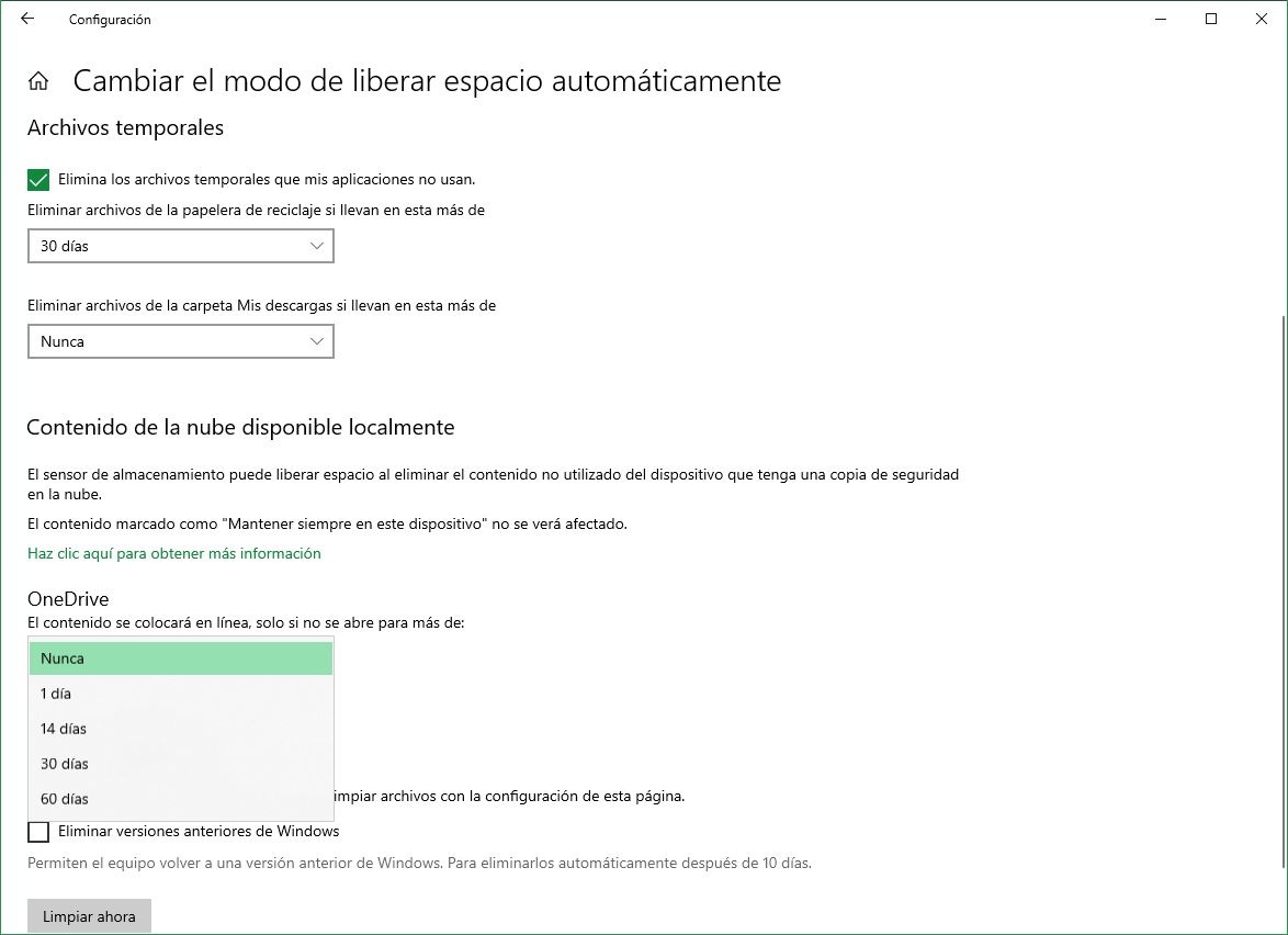 Comme nous pouvons le voir, cette fonction se chargera de supprimer localement le contenu téléchargé depuis OneDrive qui n’a pas été ouvert depuis un certain nombre de jours. Par défaut, il est configuré pour que le contenu téléchargé ne soit jamais supprimé, mais nous pouvons choisir de supprimer les fichiers qui ne sont pas ouverts dans un jour, dans deux semaines, dans un mois ou dans deux mois.