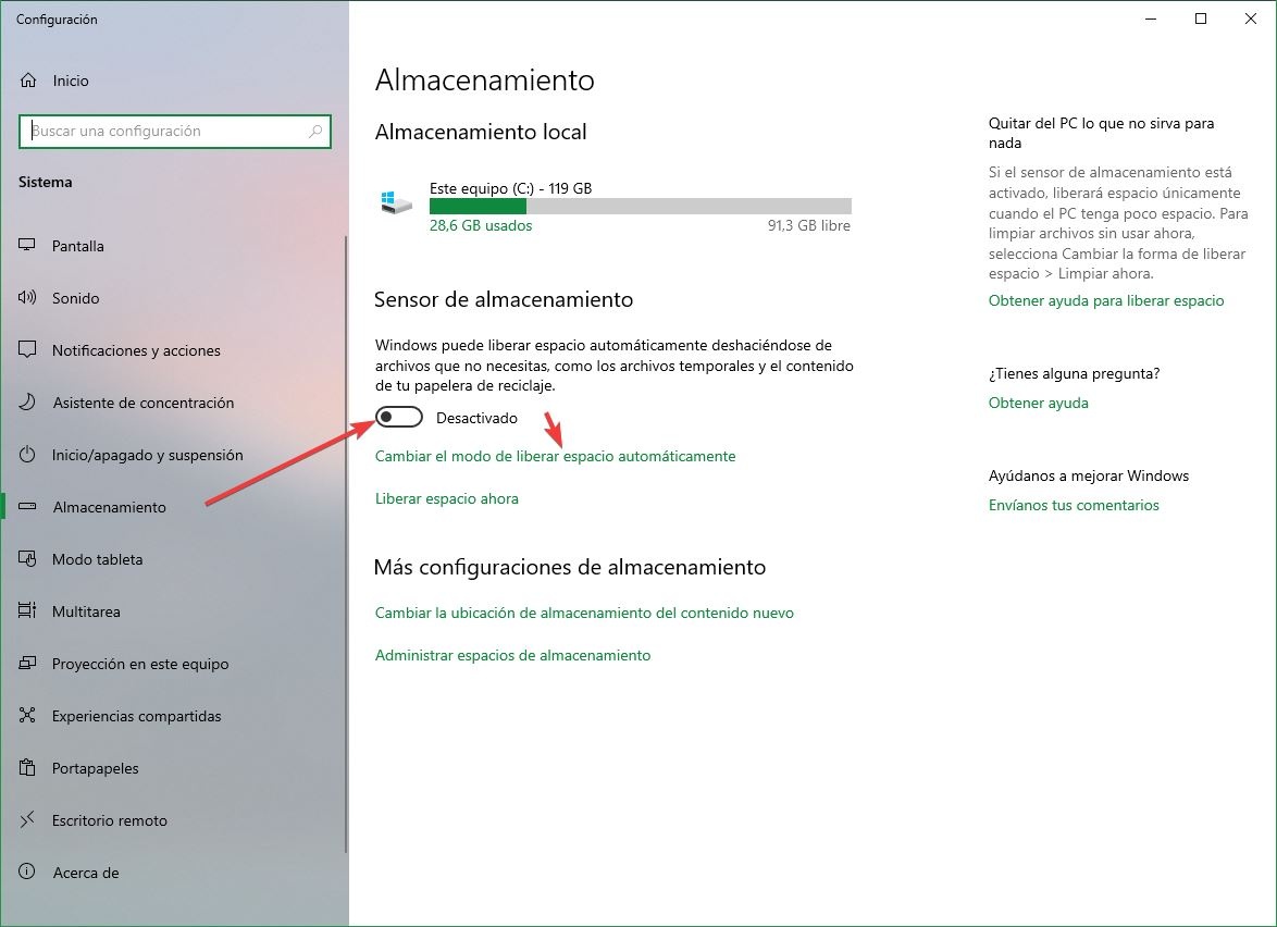 Une fois le nombre de jours choisi, nous fermons simplement la fenêtre de configuration du système d’exploitation et le capteur de stockage Windows 10 s’occupera lui-même de tout, en gardant notre système d’exploitation toujours propre et sans dépendre d’applications externes telles que, par exemple, Ccleaner.