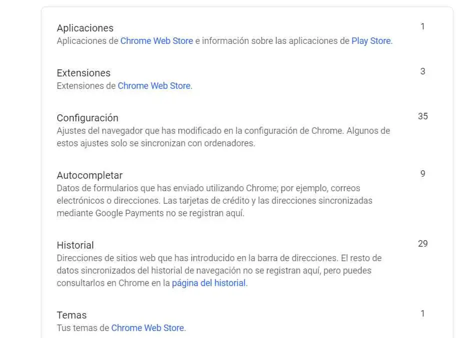C’est alors qu’une nouvelle fenêtre apparaîtra sur l’ écran dans laquelle le programme indique toutes les informations que le navigateur a sauvegardées et stockées dans le cloud à ce jour afin que nous puissions y accéder depuis le reste des appareils avec Chrome. Cela inclut des éléments tels que l’historique de navigation , nos mots de passe personnels utilisés au fil du temps, les signets enregistrés, etc.