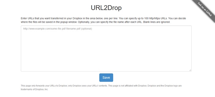 Il s’agit d’un autre outil gratuit pour télécharger des fichiers sur Dropbox via une simple URL que, comme dans le cas précédent, nous pouvons l’utiliser pour télécharger un ou plusieurs fichiers simultanément. En fait, la plate-forme nous permet de télécharger jusqu’à 100 fichiers à partir de leurs URL en même temps, tous directement sur notre compte Dropbox. Pour ce faire, il suffit de spécifier les emplacements d’ Internet et de cliquer sur » Enregistrer » depuis l’interface principale.