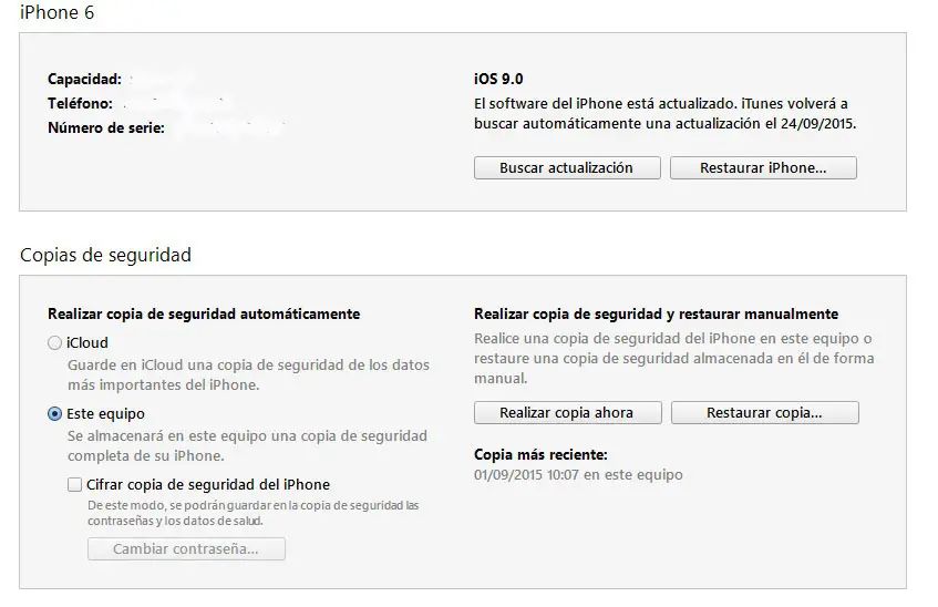 Le premier et peut-être le plus important. Chaque fois que nous mettons à jour vers un nouveau système d’exploitation, il est recommandé de faire une sauvegarde du téléphone ou de la tablette . Il est préférable de le faire via iTunes en connectant l’appareil à l’ordinateur, bien que cela puisse également être fait via iCloud. La première option est plus simple car il vous suffit de le connecter au PC, d’ouvrir iTunes et de cliquer là où il est dit «Faire une copie maintenant».