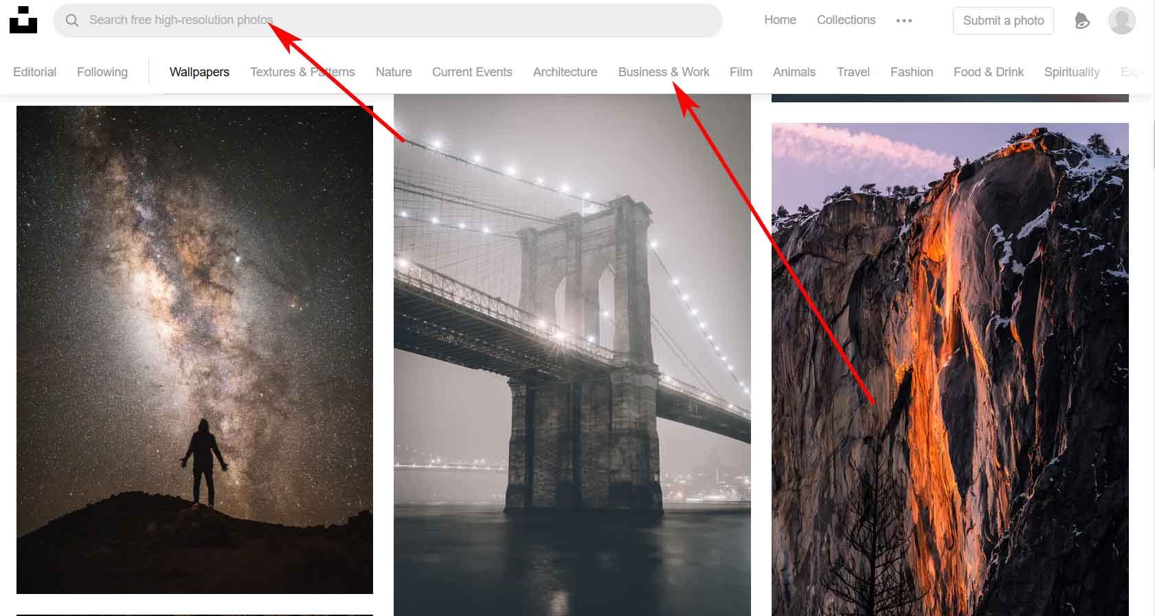 Il s’agit de Unsplash , une plateforme en ligne qui nous propose des contenus photographiques de toutes sortes et appartenant à une grande variété de thèmes afin que nous puissions les utiliser dans nos propres projets sans aucun problème. Pour cela, il dispose de son propre moteur de recherche, en plus d’une série de catégories qui sont répertoriées en haut de l’interface principale.