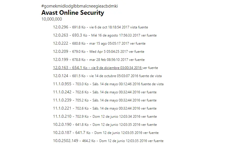 Dès que nous entrons sur le site Archive des extensions Chrome, nous trouvons une liste de toutes les extensions disponibles . Par conséquent, il suffit de trouver celui qui nous intéresse et de cliquer dessus. Ensuite, une liste de toutes les versions de cette extension sera affichée avec le numéro de version, la taille qu’elle occupe, la date de sa sortie, un lien pour que nous puissions voir son code source et une description en bas où il se trouve signalé ce que fait cette extension.