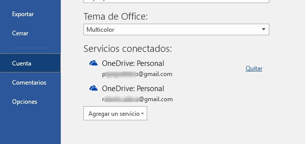 Si, en revanche, il s’agit de documents créés avec Microsoft Office auxquels nous voulons accéder ou enregistrer dans différents comptes OneDrive, il est alors possible de lier deux comptes du service de stockage cloud à partir de l’outil Office lui-même. Par exemple, dans Microsoft Word, nous devons aller dans Fichier> Compte et dans Services connectés, nous ajoutons le nouveau compte OneDrive. À partir de ce moment, nous pouvons facilement ouvrir ou enregistrer des documents à partir de l’un des deux comptes.
