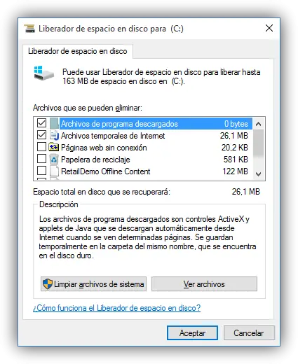 Pulsamos sobre «Liberar espacio» y veremos una nueva ventana similar a la siguiente.