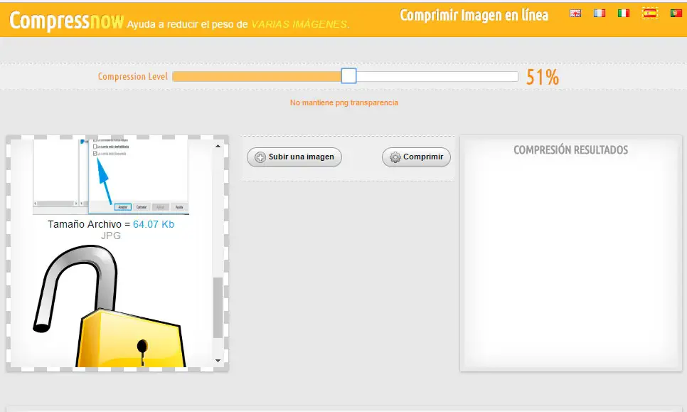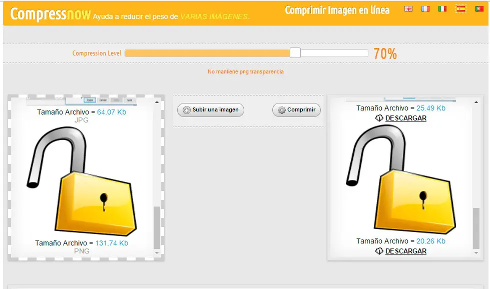 La vérité est que l’outil est capable de réduire considérablement la taille des images sans perdre en qualité , cependant, nous pouvons toujours jouer avec le pourcentage de compression que nous appliquons pour obtenir le meilleur résultat possible.