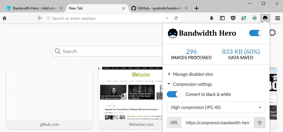 Bandwith Hero achemine le trafic d’ images via un serveur proxy pour compresser les images en fonction des paramètres. Il a une option pour configurer un serveur proxy personnalisé , donc il offre également aux utilisateurs la possibilité d’ajouter un niveau de confidentialité plus élevé lors de la navigation. Bien que les images doivent être compressées avant de les transférer vers le navigateur, il n’y a pas de retard dans le chargement du Web et il s’agit d’un processus automatisé, il ne nécessite donc aucun type d’interaction de la part de l’utilisateur.