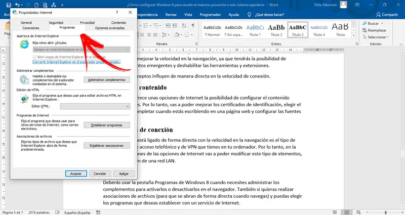 Vous devez utiliser l’ onglet Programmes de Windows 8 lorsque vous devez gérer des modules complémentaires pour les activer ou les désactiver dans le navigateur. Aussi si vous souhaitez faire des associations de fichiers (afin qu’ils s’ouvrent directement lorsque vous naviguez) et que vous pouvez choisir les programmes que vous souhaitez établir avec un service Internet.