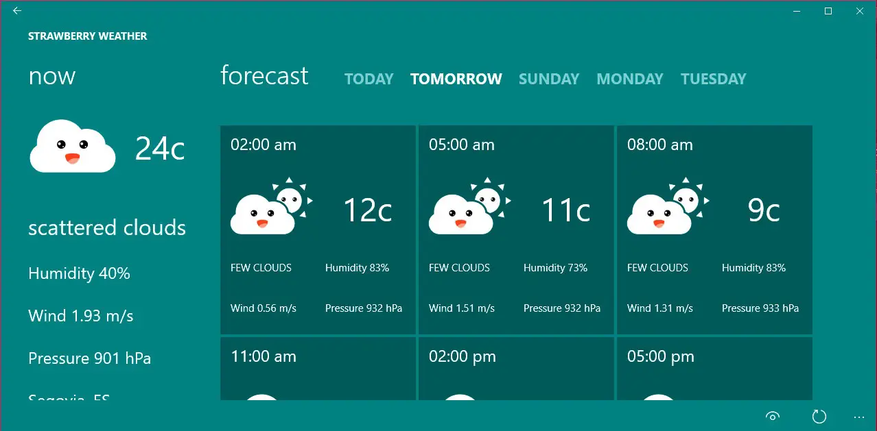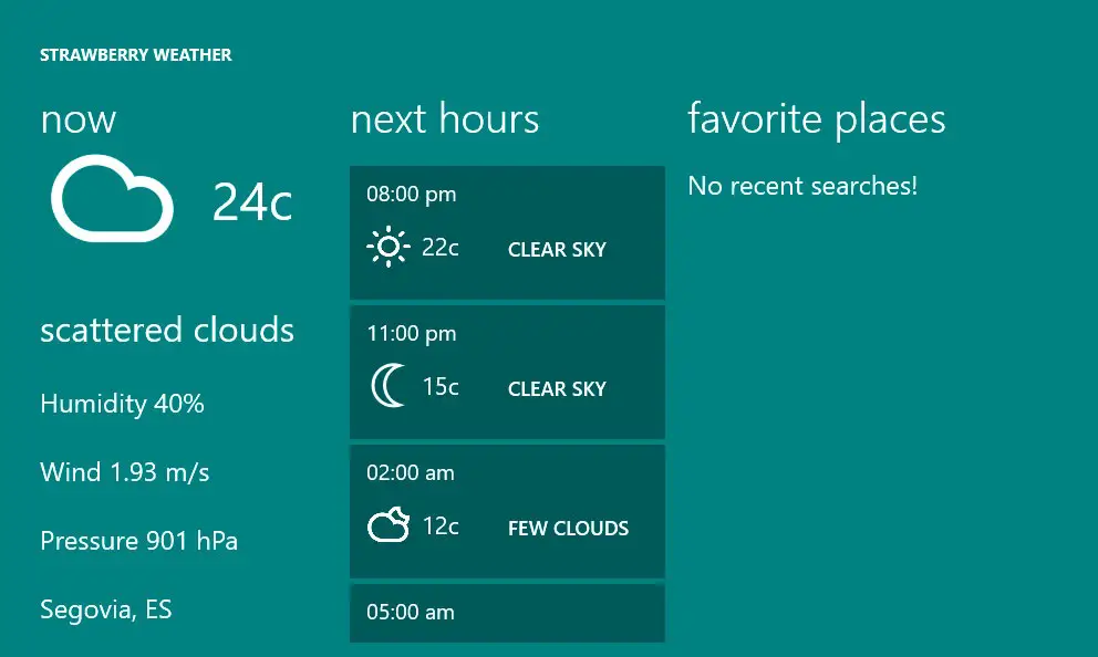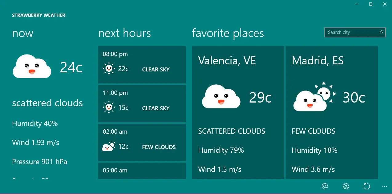 Parmi certains d’entre eux, il est possible de choisir entre trois types d’icônes différents qui s’afficheront pour indiquer l’heure à laquelle il va faire ou de choisir parmi un grand nombre de thèmes aux couleurs différentes. Strawberry Weather est disponible gratuitement dans le Windows Store, vous pouvez l’installer à partir de ce même lien .