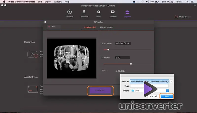 Il est à noter qu’il vous permettra également de télécharger des vidéos depuis YouTube, Vimeo et jusqu’à 10000 sites Web. En référence à la procédure à suivre pour convertir vos vidéos en GIF, nous soulignons que vous devez cliquer sur l’option «GIF Maker» une fois que vous ouvrez le programme. Sélectionnez ensuite l’heure de début et ajustez la taille et la durée. Maintenant, cliquez sur «Créer un GIF» et lorsque le processus est terminé, cliquez simplement sur «Enregistrer» .