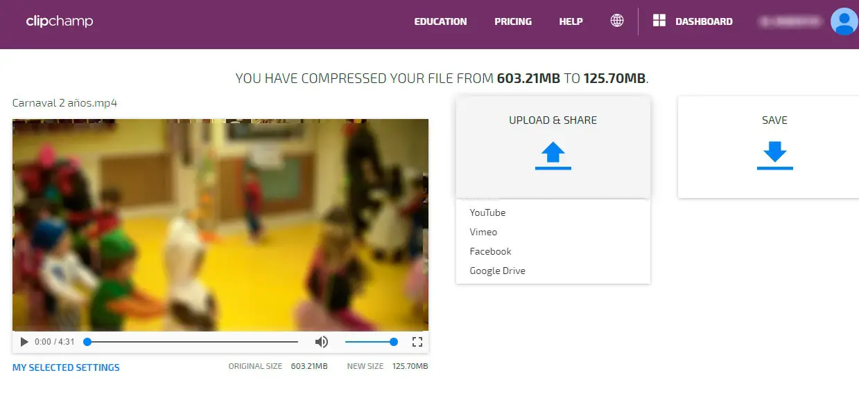 Lorsque nous l’avons à notre goût, nous pouvons choisir si nous voulons l’optimiser pour le publier sur le web, le partager via mobile ou même sous forme de GIF et commencer l’optimisation ou la compression. Dans l’exemple illustré dans les images, une vidéo d’ un peu plus de 600 Mo a été choisi pour le Web et comme vous pouvez le voir, le résultat est une vidéo de 125 Mo . Une taille qui peut être encore plus réduite si l’on choisit un autre type d’optimisation. Même ainsi, il occupe déjà près d’un sixième de la taille d’origine et nous pouvons le télécharger sur des sites comme YouTube, Google Drive, Vimeo ou Facebook avec plus de confort et de rapidité, le partager ou simplement le télécharger sur notre ordinateur.