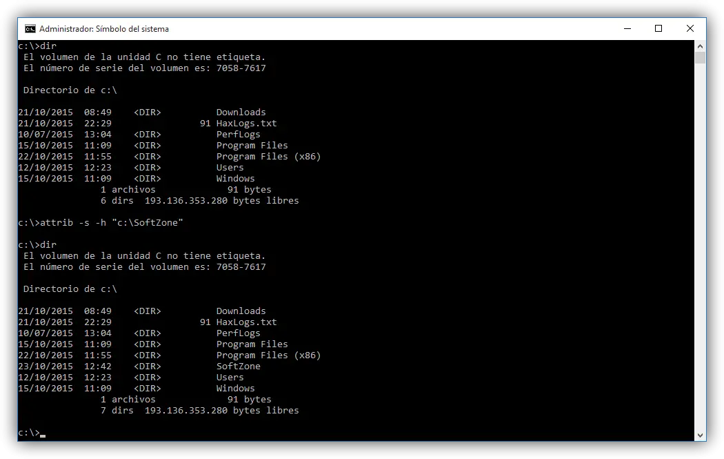 Une fois cette commande exécutée, le dossier sera caché et configuré comme un dossier système, non visible ou avec l’option «afficher les fichiers cachés» activée. Si nous voulons que ce dossier soit à nouveau visible, il faut avoir mémorisé le chemin et le nom du dossier (car sinon nous ne pourrons pas le connaître) et écrire en CMD:
