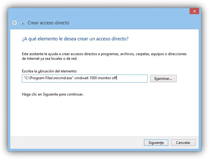 L’assistant pour créer un nouveau raccourci apparaîtra. Dans la première fenêtre, nous choisissons l’emplacement de l’outil NirCmd et le paramètre correspondant à l’arrêt de l’écran, en étant comme suit: