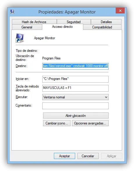 À partir de là, nous changeons l’icône pour celle que nous voulons (la vilaine icône de l’ordinateur avec la lune de style Windows 95 est très bien rendue par Windows 8.1) et nous attribuerons le raccourci clavier, si nous le voulons, à partir duquel nous allons éteignez également le moniteur.