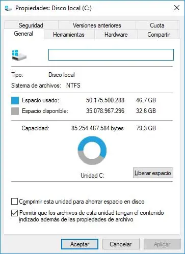 Plus précisément, nous devons vérifier si le lecteur sur lequel Windows est installé dispose d’au moins 10 Go d’espace libre. Pour ce faire, ouvrez simplement l’Explorateur de fichiers Windows, sélectionnez le lecteur et cliquez avec le bouton droit pour accéder à ses propriétés . Là, dans l’onglet Général , nous trouverons la quantité d’espace total dans la partition, l’espace que nous avons occupé et ce dont nous disposons.