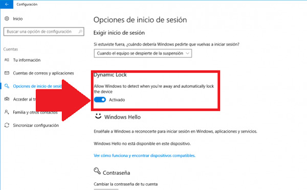 - Dans la nouvelle fenêtre qui apparaît , vous devrez activer l’interrupteur à « Dynamic Lock ».