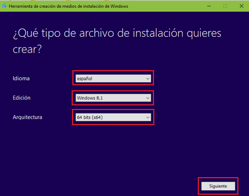 La fenêtre de l’outil de création de support d’installation s’ouvre. Choisissez la langue, l’édition et l’architecture appropriées . Dans notre cas, « espagnol », « Windows 8.1 » et, dans la dernière section « 32 bits (x86) » ou « 64 bits (x64) ». Lorsque vous l’avez fait, cliquez sur » Suivant «.