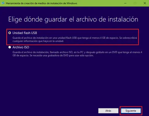 Ensuite, vous serez invité à enregistrer le programme d’installation . Vous pouvez choisir « clé USB » ou « fichier ISO ». Dans le premier cas, il est nécessaire d’avoir un appareil avec au moins 4 Go d’espace libre ; dans le second, un DVD dans lequel enregistrer l’image du disque. Nous choisissons celui que nous choisissons, nous devrons avoir préalablement connecté une clé USB pour le premier cas, ainsi qu’un DVD dans l’ordinateur pour le second.