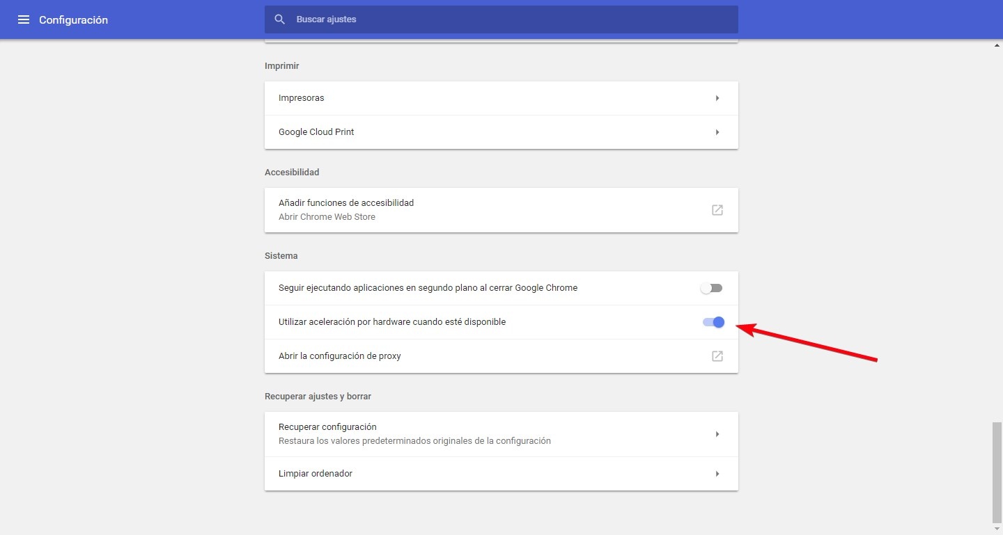 Tant qu’un ordinateur a pris en charge le matériel, l’accélération matérielle de Google Chrome est activée. Par conséquent, si nous rencontrons ces problèmes avec des polices floues, nous pouvons facilement les résoudre en désactivant cette accélération. Pour ce faire, nous allons simplement ouvrir les paramètres du navigateur (nous pouvons écrire dans la barre d’adresse « chrome: // settings / »), nous faisons défiler vers le bas, cliquez sur « Paramètres avancés » et continuer à faire défiler jusqu’à la section «Système» jusqu’à vous trouvez une option appelée » Utiliser l’accélération matérielle lorsqu’elle est disponible «.