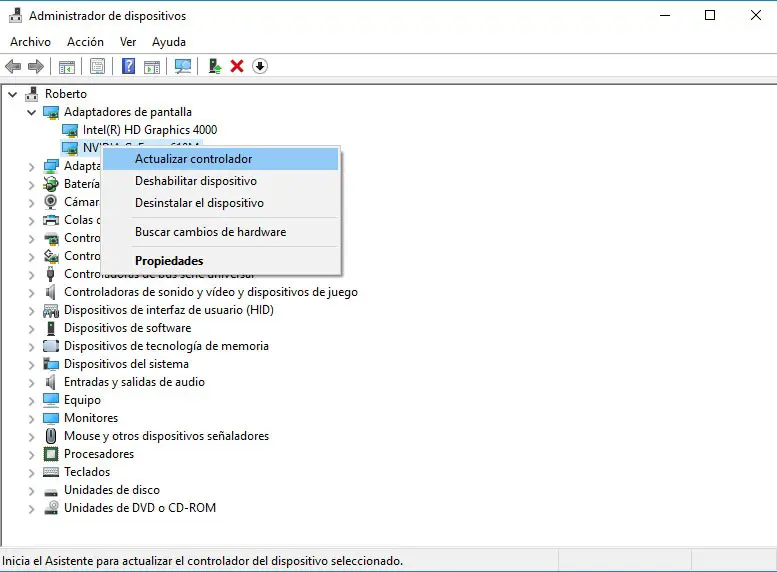 Pour ce faire, nous ouvrons le Gestionnaire de périphériques Windows, déployons les adaptateurs vidéo ou les pilotes et cliquons sur notre carte pour sélectionner l’option Mettre à jour le pilote. Si après cela, nous continuons la même chose, nous devons faire de même, mais au lieu de sélectionner l’option de mise à jour, nous allons désinstaller le pilote, redémarrer l’ordinateur et réinstaller ultérieurement le pilote.
