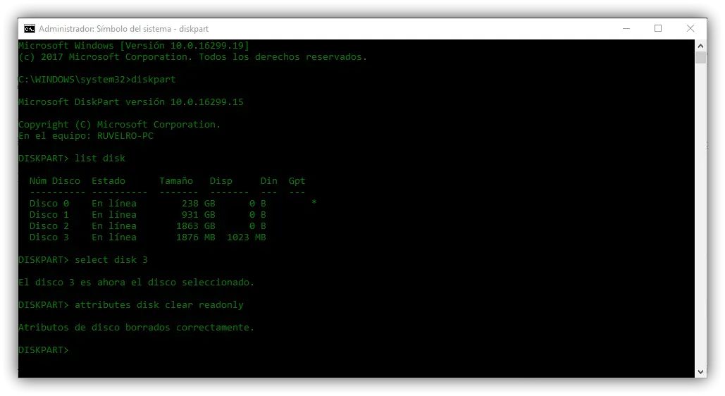 Pour ce faire, avec la carte SD connectée à notre ordinateur, nous ouvrirons une fenêtre CMD, avec des autorisations d’administrateur, et nous exécuterons les commandes suivantes: