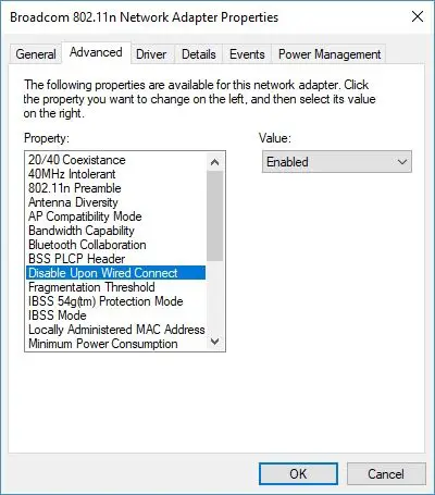 Une fois là-bas, dans la section Connexions, nous sélectionnons notre réseau et dans la fenêtre d’état WiFi qui s’ouvre, nous cliquons sur le bouton Propriétés . Cela ouvrira une nouvelle fenêtre où notre carte réseau apparaîtra en haut à côté d’un bouton Configurer . En cliquant dessus, la fenêtre des propriétés de la carte réseau s’affiche dans laquelle nous devons aller dans l’onglet Options avancées et dans la liste des propriétés, recherchez l’option Déconnecter lorsqu’un câble est connecté et marquez sa valeur dans Activé .
