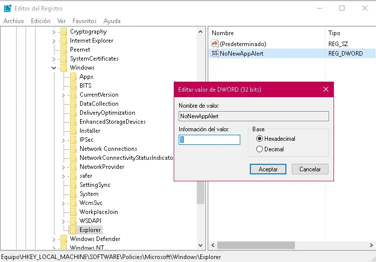 Une fois sur place, nous devons créer une nouvelle valeur DWORD (32 bits) avec le nom NoNewAppAlert et une fois créée, double-cliquez dessus pour lui attribuer la valeur 1 . Enfin, nous devons fermer l’éditeur de registre pour que les modifications soient enregistrées et à partir de ce moment, nous devrions cesser de voir comment ces notifications ennuyeuses sont affichées. Il est probable que nous devrons redémarrer l’ordinateur si nous constatons que les modifications ne sont pas appliquées immédiatement.