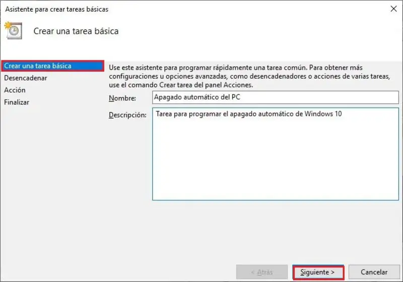 Maintenant, nous continuons à indiquer le nom que nous voulons donner aux tâches que nous avons définies, par exemple nous allons mettre « Arrêt automatique du PC» , et nous pouvons également laisser une brève description pour indiquer que la tâche que nous avons créée est d’éteindre automatiquement notre Ordinateur Windows 10.