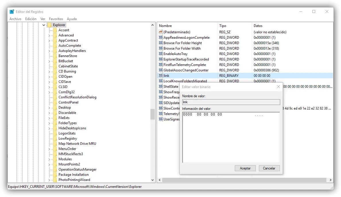 On y verra une valeur appelée « lien ». S’ils n’existent pas, nous le créons à la main en faisant un clic droit et en choisissant «Nouveau> Valeur binaire» et nous lui donnerons le nom «lien».