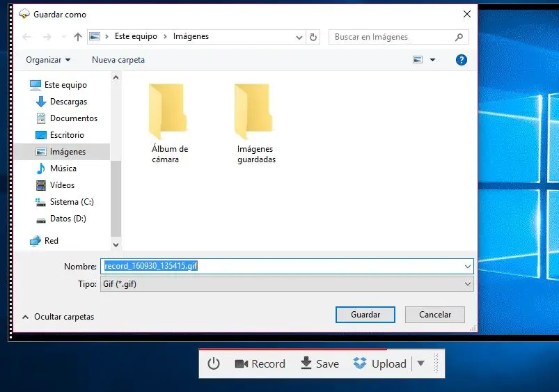 Pour ce faire, nous téléchargeons et lançons CloudShot depuis son site officiel , choisissons la zone de notre écran de bureau que nous voulons enregistrer et cliquons sur l’option Enregistrer . Nous faisons tout ce que nous voulons sur notre bureau et une fois terminé, nous cliquons sur Terminé , ce qui suspendra l’enregistrement et nous montrera l’option de sauvegarde ou de sauvegarde . Ensuite, une fenêtre de boîte de dialogue s’ouvrira pour indiquer où nous voulons enregistrer le fichier GIF et nous l’aurons prêt à partager avec qui nous voulons.