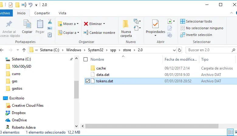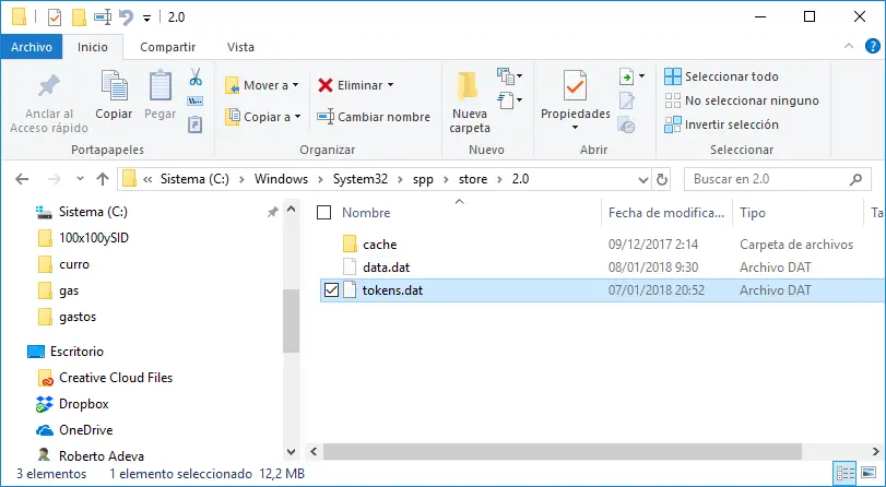 Dans tous les cas, quelle que soit la cause de l’erreur 0xC004F012 lors de l’activation de Windows 10, la solution consiste à reconstruire le fichier Tokens.dat. Pour ce faire, la première chose que nous allons faire est d’ouvrir l’explorateur de fichiers Windows 10 et d’accéder au chemin C: WindowsSystem32SPPStore2.0 . Une fois sur place, nous renommons le fichier tokens.dat en tokens.old, par exemple.