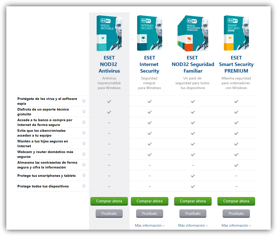 Avec le lancement de la nouvelle gamme de produits ESET 10, la version Internet Security est introduite , une version supérieure à NOD32 Antivirus mais inférieure à Smart Security Premium. Cette version présente, globalement, les mêmes caractéristiques que Smart Security à l’exception du gestionnaire de mots de passe, du localisateur (qui nous permet de localiser notre ordinateur en cas de vol) et d’un nouvel outil qui nous permet de crypter nos données les plus sensibles. Et par conséquent, il est également moins cher que l’édition Premium.