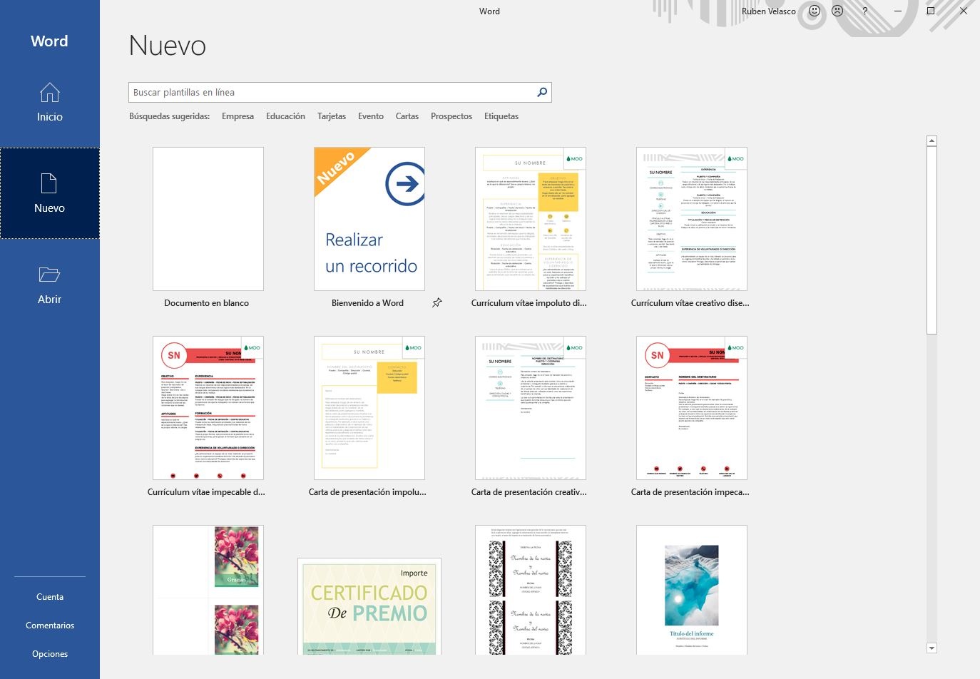 Il peut également être plus confortable pour nous de travailler ainsi, mais dans certains cas spécifiques, nous souhaitons ouvrir l’historique des fichiers ou accéder aux modèles. Pour ce faire, cliquez simplement sur le menu «Fichier» qui apparaît dans la partie supérieure gauche de la fenêtre, dans la barre du ruban, et nous pourrons revoir la section historique et les modèles Word.