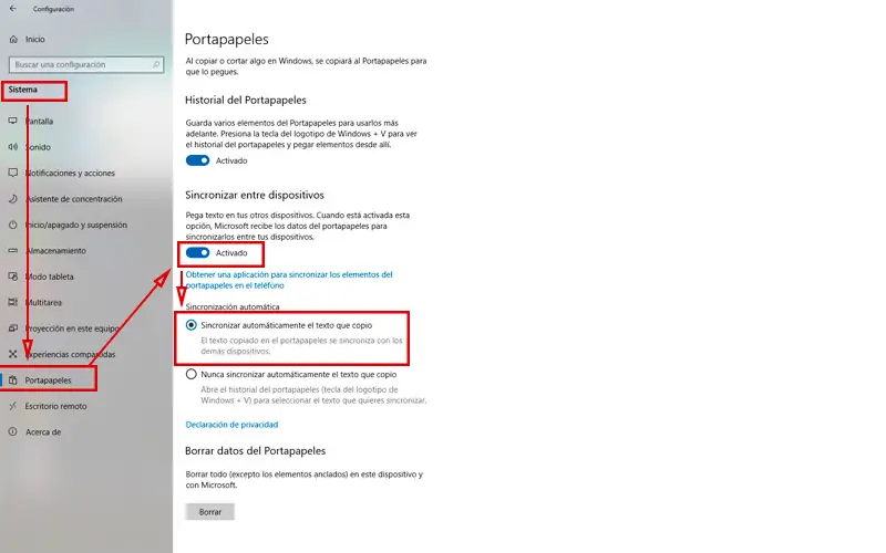 C’est l’autre grande nouveauté que Windows nous a préparée en version 10. Elle nous permet de stocker les textes et images que nous plaçons sur le presse-papiers dans le cloud . Ce contenu sera disponible pour tous les appareils sur lesquels nous nous sommes connectés avec les mêmes informations d’identification.