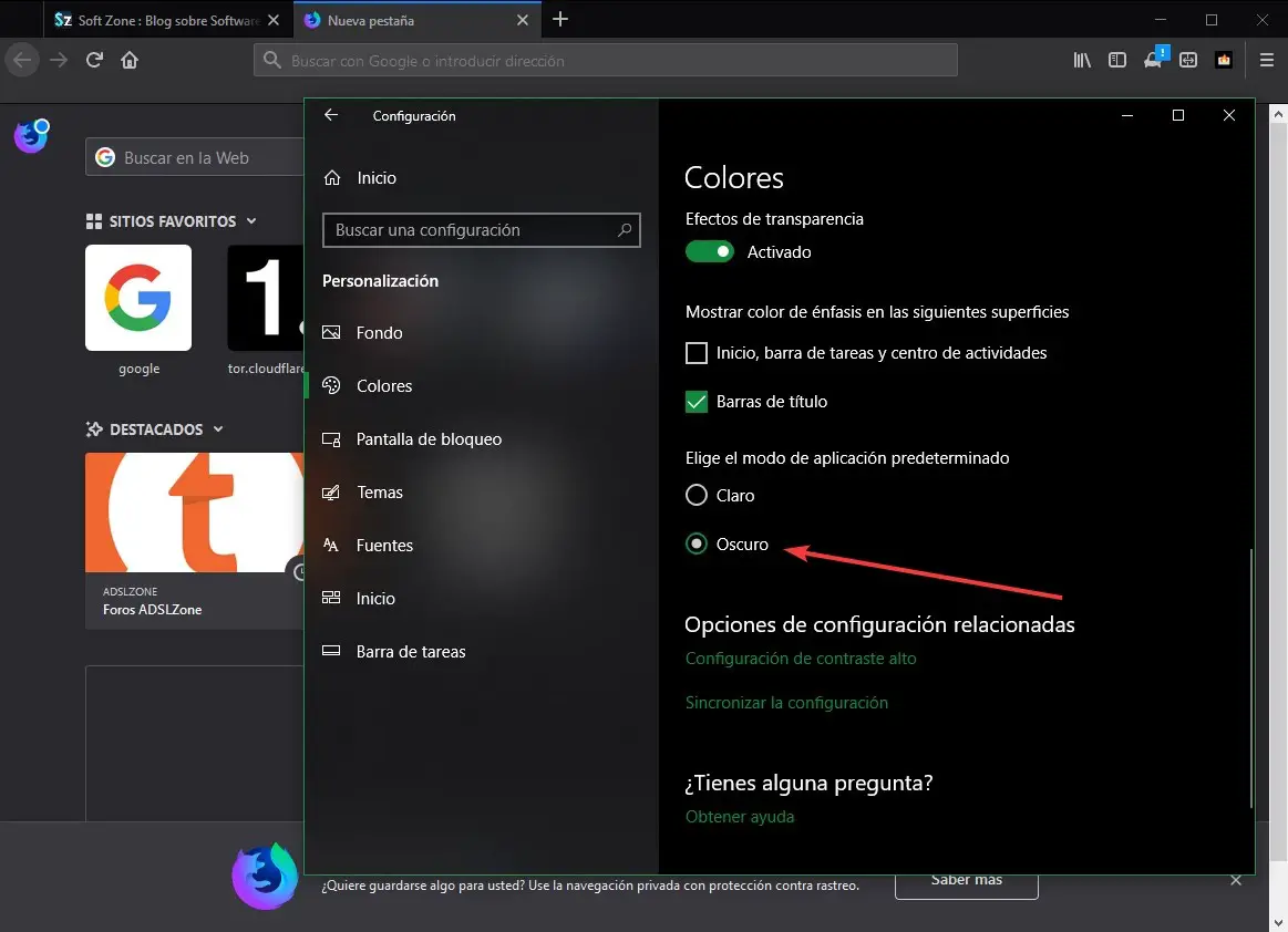 Si nous remplissons les deux exigences simples ci-dessus, la prochaine chose à faire est d’activer le thème sombre de Windows 10. Pour ce faire, nous allons entrer dans le menu Paramètres> Personnalisation> Couleurs et ici nous allons activer le «mode sombre» de Windows 10 . Ce faisant, nous verrons automatiquement que ce mode est également activé dans Firefox, passant automatiquement à son thème sombre sans avoir à faire autre chose.