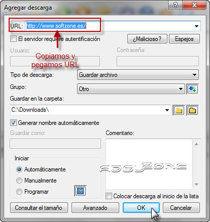 Une fois pressé, un écran apparaîtra où nous devons coller l’URL de la page que nous voulons télécharger. Une fois cela fait et en changeant si nous voulons le dossier de destination, nous appuierons simplement sur le bouton OK et le gestionnaire téléchargera la page Web.