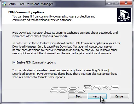 Dans une partie du processus, nous pourrons activer FDM Community Options, qui nous offre, grâce à la communauté des utilisateurs du gestionnaire de téléchargement, de connaître les opinions et de rapporter les fichiers que nous allons télécharger, en évitant de le faire dans le cas où il contient des logiciels espions ou des logiciels malveillants.