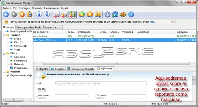 Grâce à la vaste communauté d’utilisateurs de Free Download Manager, nous pourrons savoir si un fichier est malveillant ou le commenter. De plus, nous pouvons collaborer avec la communauté en signalant des fichiers malveillants.