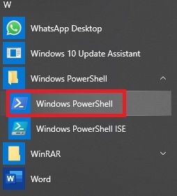 On peut accéder à Windows PowerShell depuis le menu démarrer, à la fin de la liste de toutes les applications, ou aussi depuis le moteur de recherche à côté du bouton de démarrage.