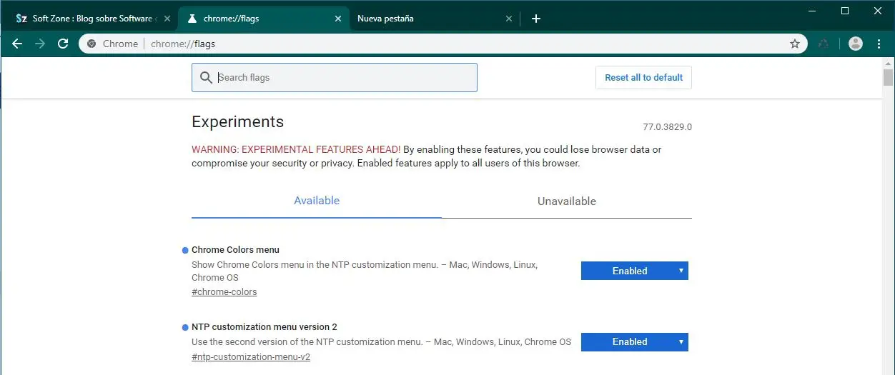 Les nouveaux thèmes pour la page d’accueil et les nouvelles options de personnalisation du navigateur sont encore en phase expérimentale, donc pour les tester, nous devrons les activer manuellement à partir des drapeaux du navigateur. Nous pouvons écrire les lignes suivantes dans la barre d’adresse et marquer chaque option comme «Activé»: