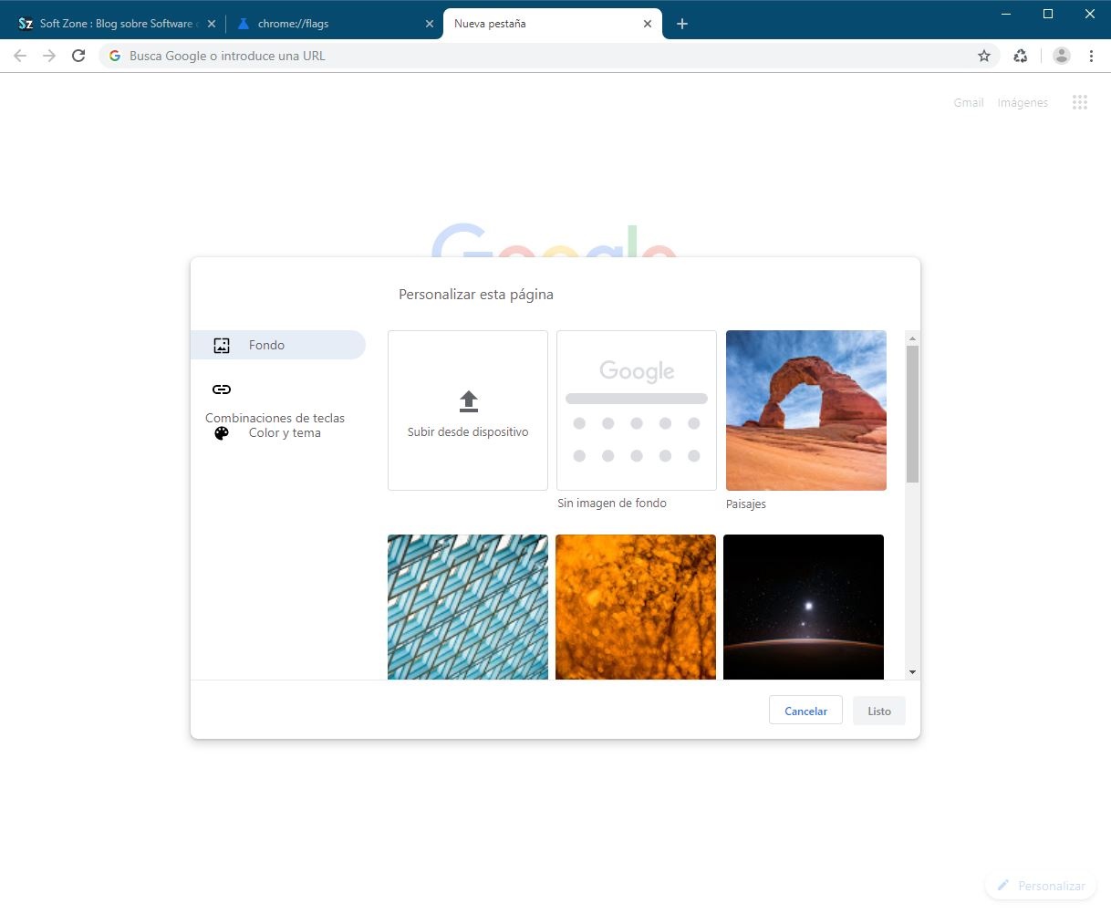 La première chose que nous verrons est la possibilité de choisir l’un des nombreux fonds que Google nous propose pour personnaliser le navigateur. Nous pouvons également télécharger notre propre arrière-plan et même le laisser vide, avec l’apparence caractéristique de Google.