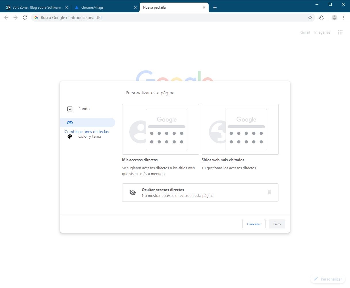 Lorsque nous ouvrons un nouvel onglet, nous pouvons voir la page de recherche Google populaire. Dans la partie inférieure droite, nous verrons le bouton de personnalisation que nous voyons depuis longtemps dans la version stable du navigateur mais, lorsque nous l’appuyons, nous pouvons voir qu’un nouveau panneau apparaît avec de nouvelles options.
