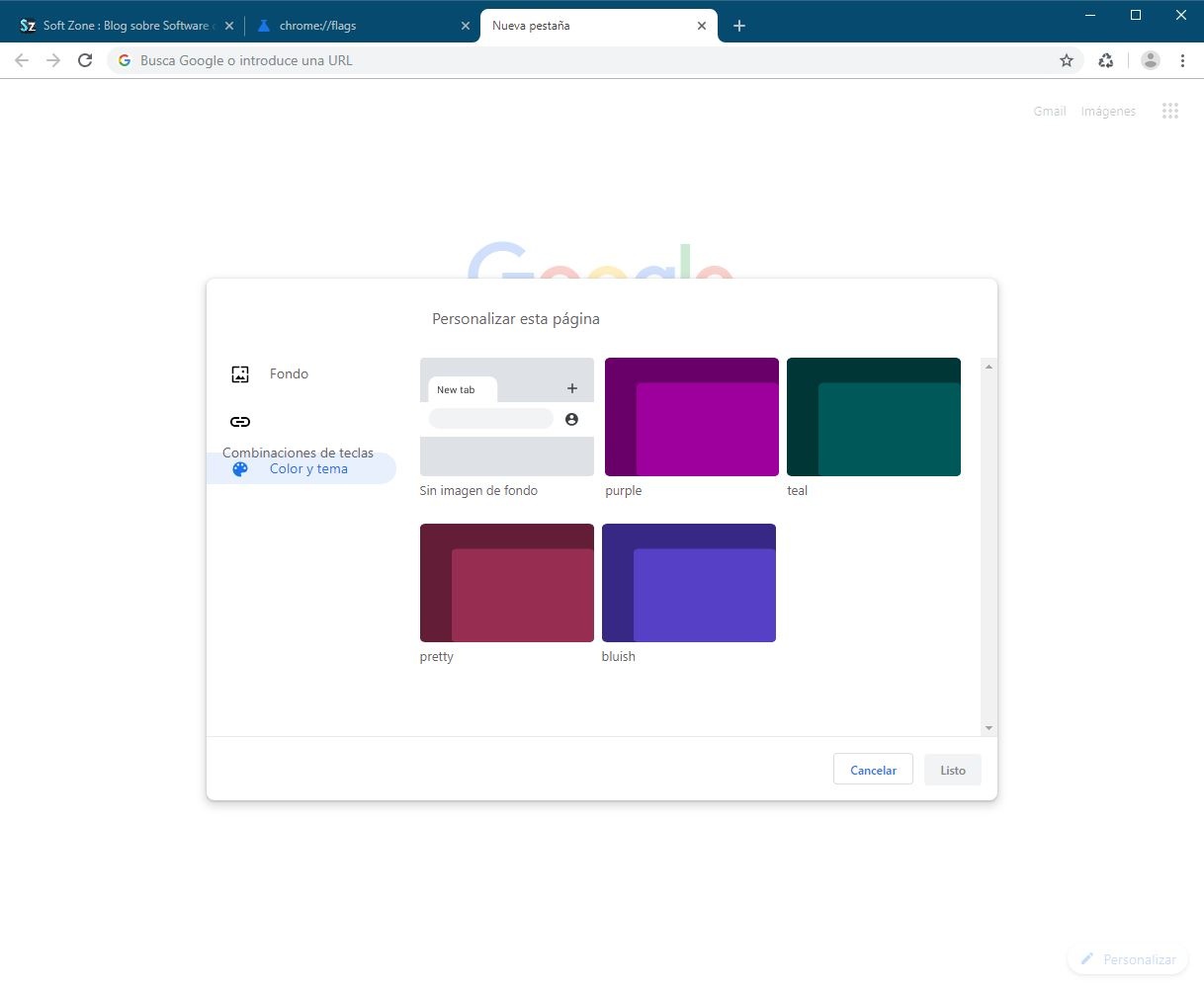 Enfin, l’option de personnalisation la plus intéressante est « Couleur et thème ». Cette option nous permet de configurer un arrière-plan coloré sur la page d’accueil de Google Chrome et, en plus, elle attribuera un thème de couleur au reste du navigateur afin que tout soit en parfait accord.