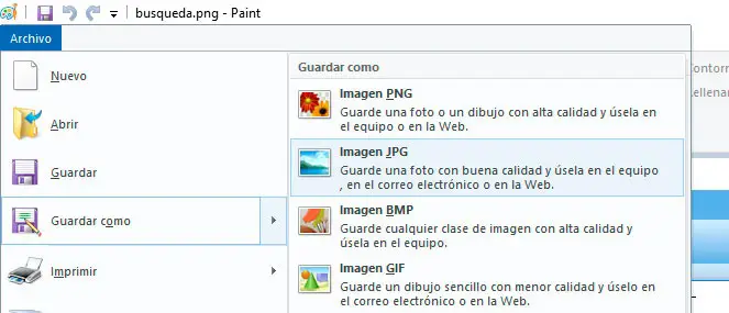 Si no tenemos Photoshop, seguro que no nos falta el famoso Paint, ya que está integrado con el propio sistema Windows. Esta herramienta también nos va a permitir convertir una imagen PNG a JPG sin perder la calidad. Abrimos la imagen en Paint y vamos a la opción del menú Archivo > Guardar como> imagen JPEG. Elegimos la ubicación donde queremos guardar el resultadoa, pulsamos a Guardar y listo.