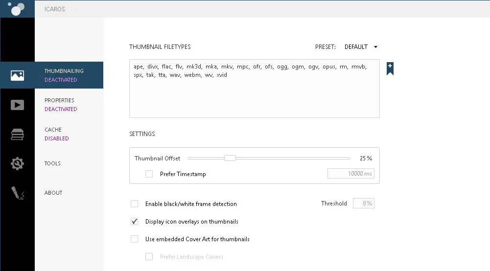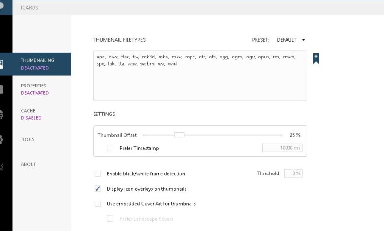 L’interface est très simple, dans le premier onglet Thumbnailing , on peut voir les types de fichiers compatibles avec Icaro et on peut même ajouter de nouveaux formats. Une fois cela fait, nous devons les activer pour qu’ils soient reconnus. Dans l’onglet Propriétés, vous pouvez voir les informations sur le fichier, les dimensions de l’image, l’artiste, le débit binaire et la fréquence d’images, etc.